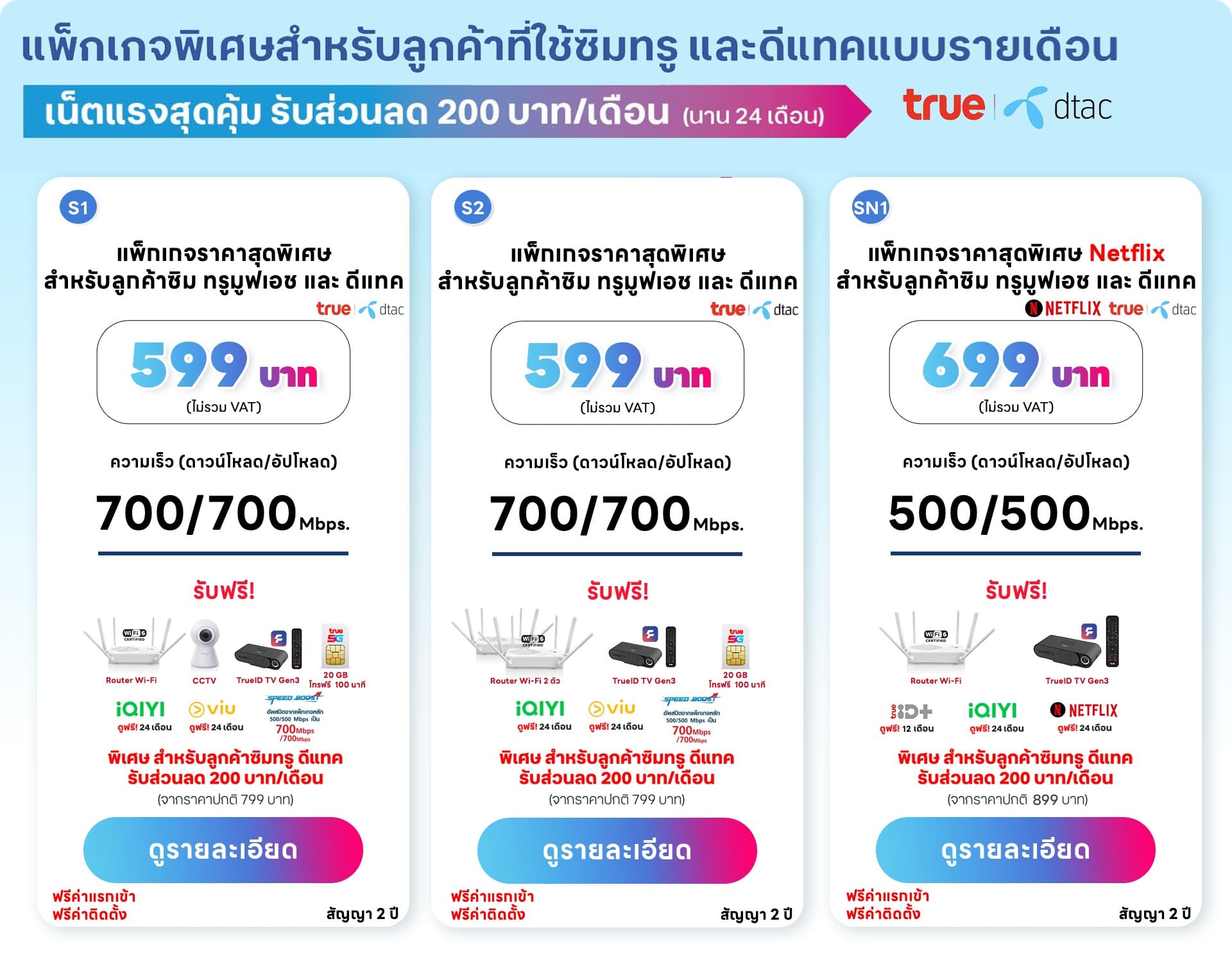 โปรเน็ตบ้านทรู สำหรับลูกค้ารายเดือน ซิม ทรู หรือ ดีเทค รับส่วนลด 200 บาท 24 เดือน